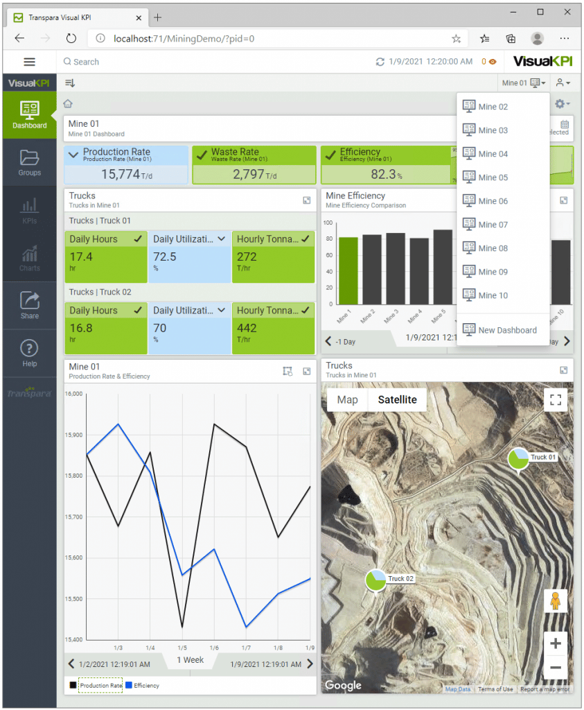 Now that you have expanded your mining empire and set up groups and KPIs to monitor it, it is time to enhance your visualizations. Visual KPI offers a range of chart options, including bar charts, managed trends, Pareto charts, Gantt charts, pie charts, XY plots, tables, and more. You can create these visualizations using the SQL remote context server.