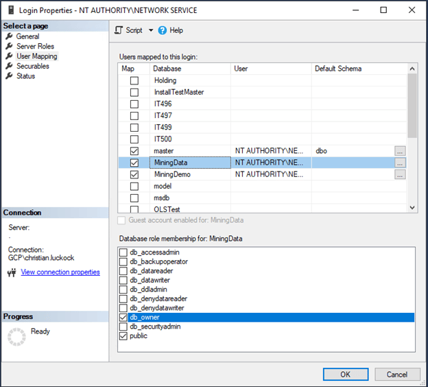 - Just like in Visual KPI database (MiningDemo), you need to allow Visual KPI access to the database. As described in Step 1, give Network Service or Boxname$ access to the database.