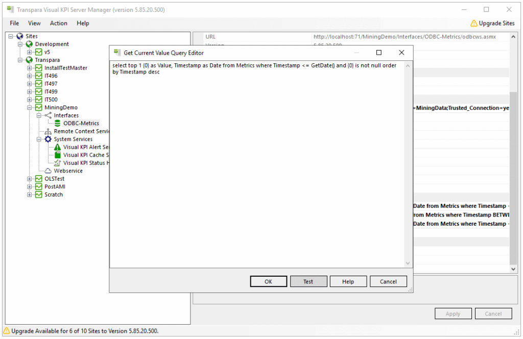 This will return a value and a timestamp. Showing you have a working and tested ODBC interface to the Metrics table.