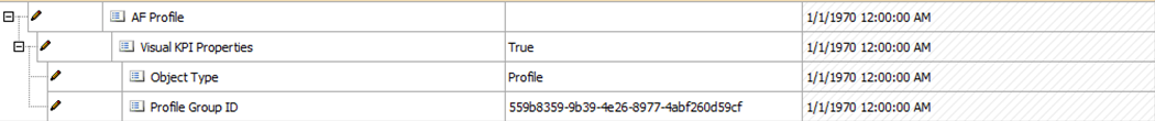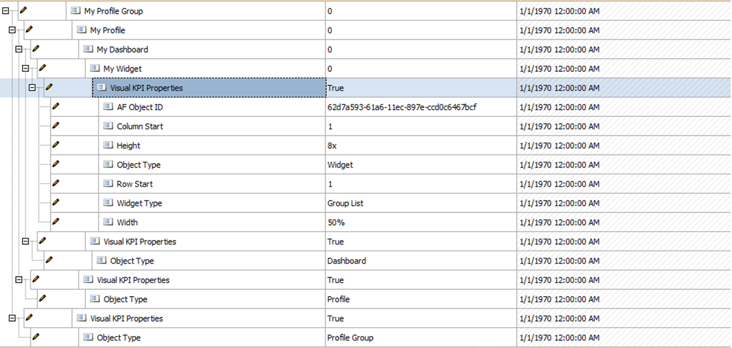 Typically, the Visual KPI AF RCS maps AF Elements to Visual KPI Groups. However, if an AF Element has a child attribute Object Type with a value of Configuration, the AF Element is not mapped to a Visual KPI Group. Instead, the child attributes are iterated through to find objects such as Profile Groups, Profiles, Dashboards, Widgets, and Bookmarks.