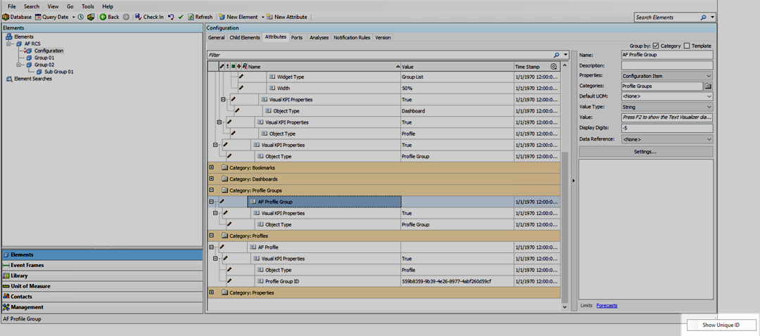 In addition to Profile Group ID, Profile ID, and Dashboard ID, most widgets will also reference an AF Object ID. Getting these IDs is a simple task, but it requires enabling the option in the PI System Explorer. To do this, right-click in the bottom right corner of the PI System Explorer to display a menu that allows you to enable (or disable) the display of the Unique AF Object IDs (GUIDs).
