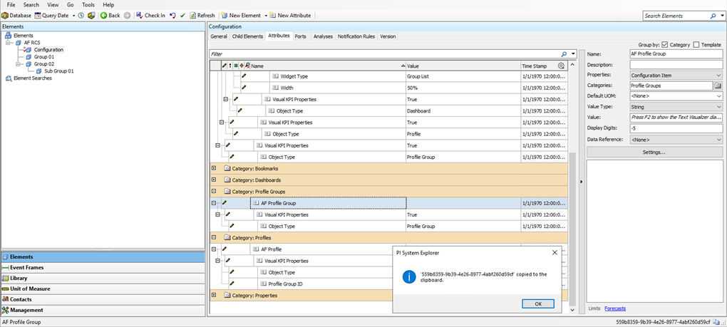 While you can create the required attributes anywhere in your AF Model to define Profile Groups, Profiles, Dashboards, and Widgets, you can also create a special AF Element specifically for this purpose. To create this configuration placeholder, create an AF Element with an attribute called Object Type and set its value to Configuration.