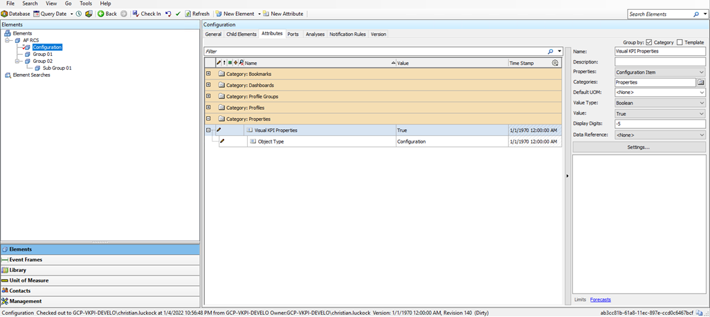 The example below uses this approach to isolate Visual KPI objects from the core AF Model. For instance, we have Group 01, Group 02, and Sub Group 01 elements in addition to a Configuration element. The Visual KPI AF RCS will create Visual KPI Groups for Group 01, Group 02, and Sub Group 01, but not for Configuration.