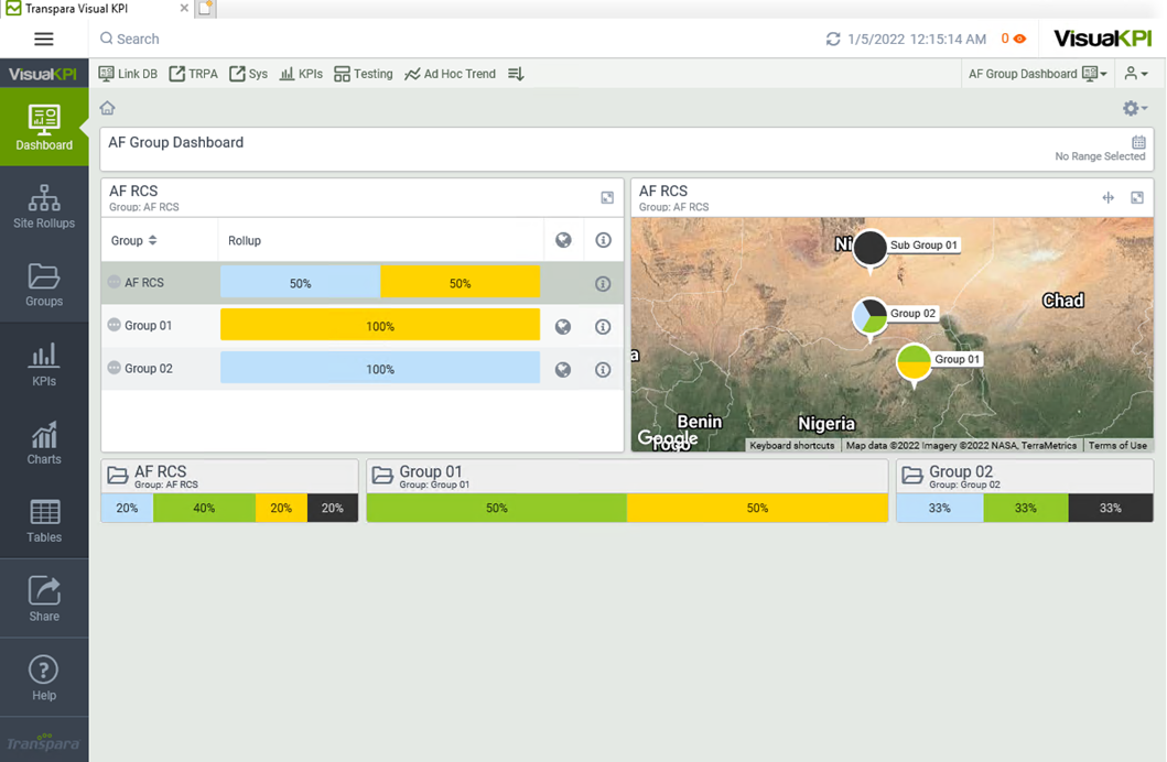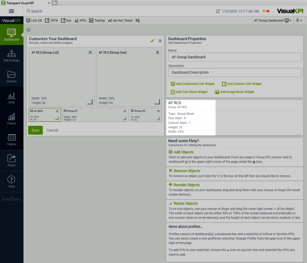 For example, if you want a dashboard with a Group List, a Group Geo, and three Group Block widgets, it is a good practice to first create it in Visual KPI.