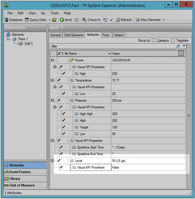 In the following example image, we've added a Level attribute to Unit 1 and set the Visual KPI Properties attribute to False, which indicates RCS should ignore this attribute and not create it as a Visual KPI value.